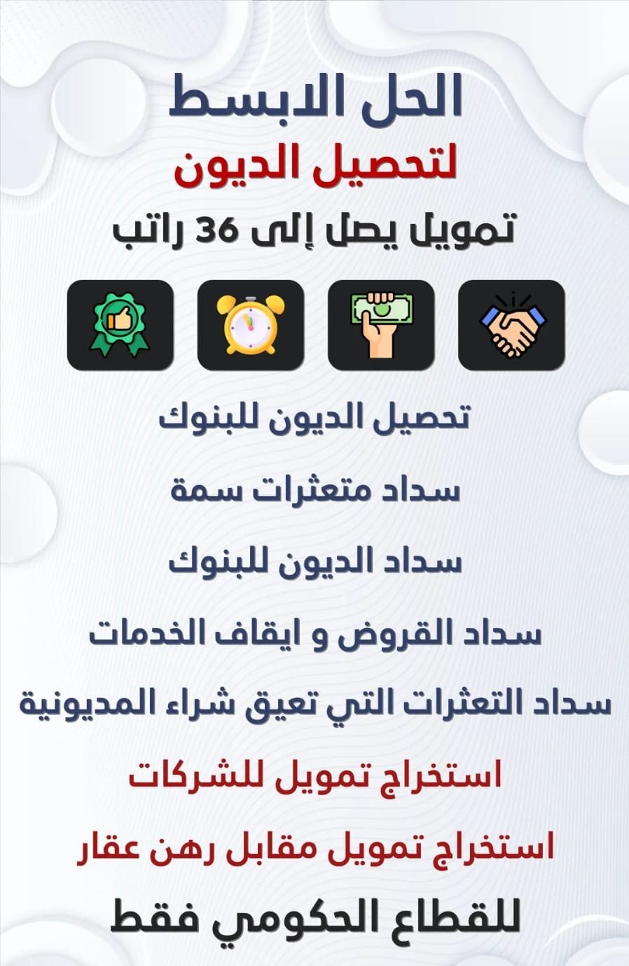 - ويتواجد فريق مميز وذو خبرة واسعة في مجال البنوك من مسددين القروض والذين لديهم جميع المعلومات حول كيفية تعامل البنوك وطرق السداد والبنود التي يضعها كل حول القروض بأنواعها.